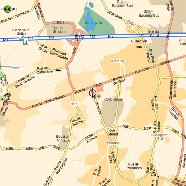 Autoroute E42, sortie 25 en direction d'Hornu. Au 1er feu rouge, à gauche. Passer devant l'hôpital du Grand Hornu et au feu rouge à droite.