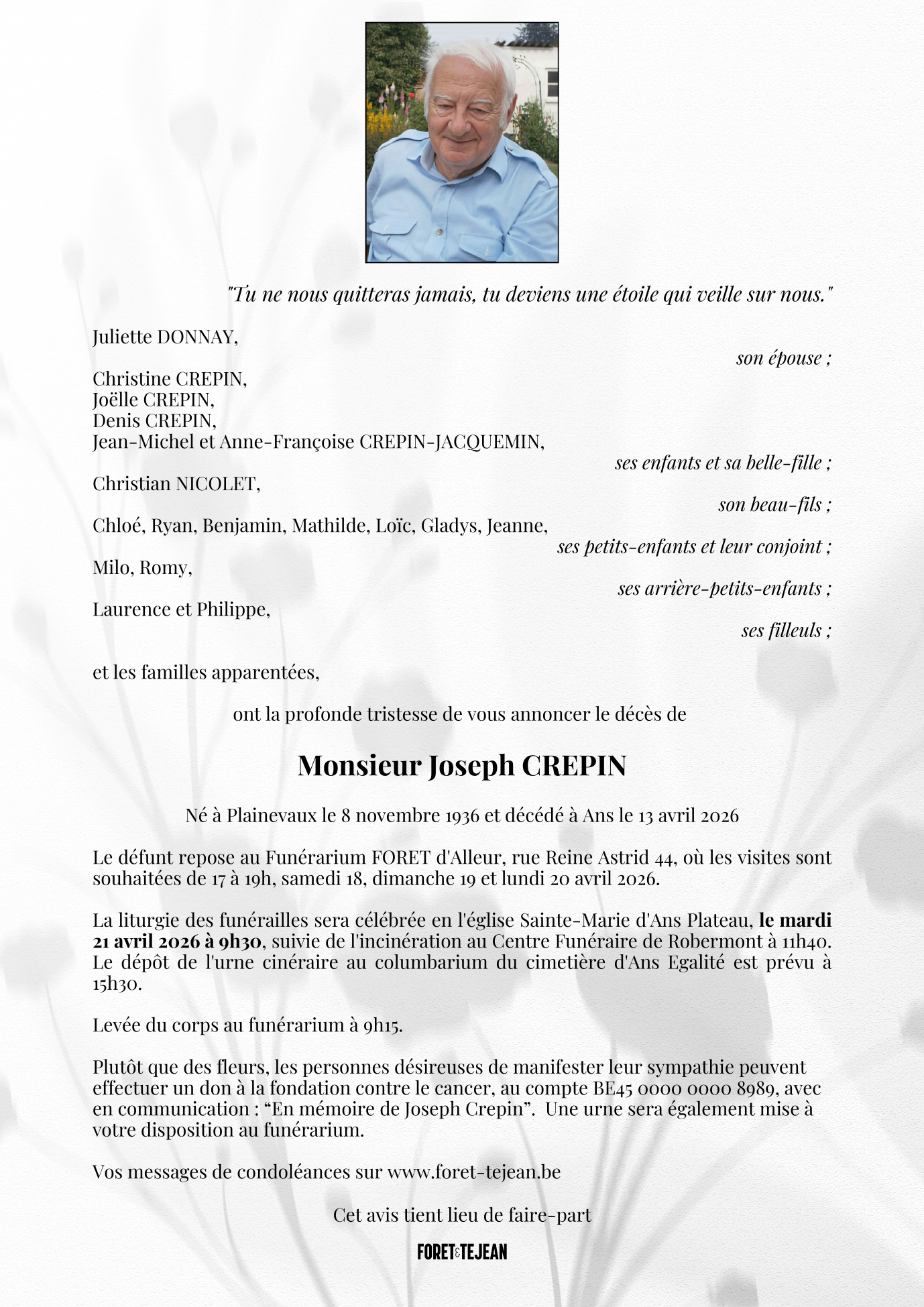 Avis de décès de Monsieur Joseph CREPIN