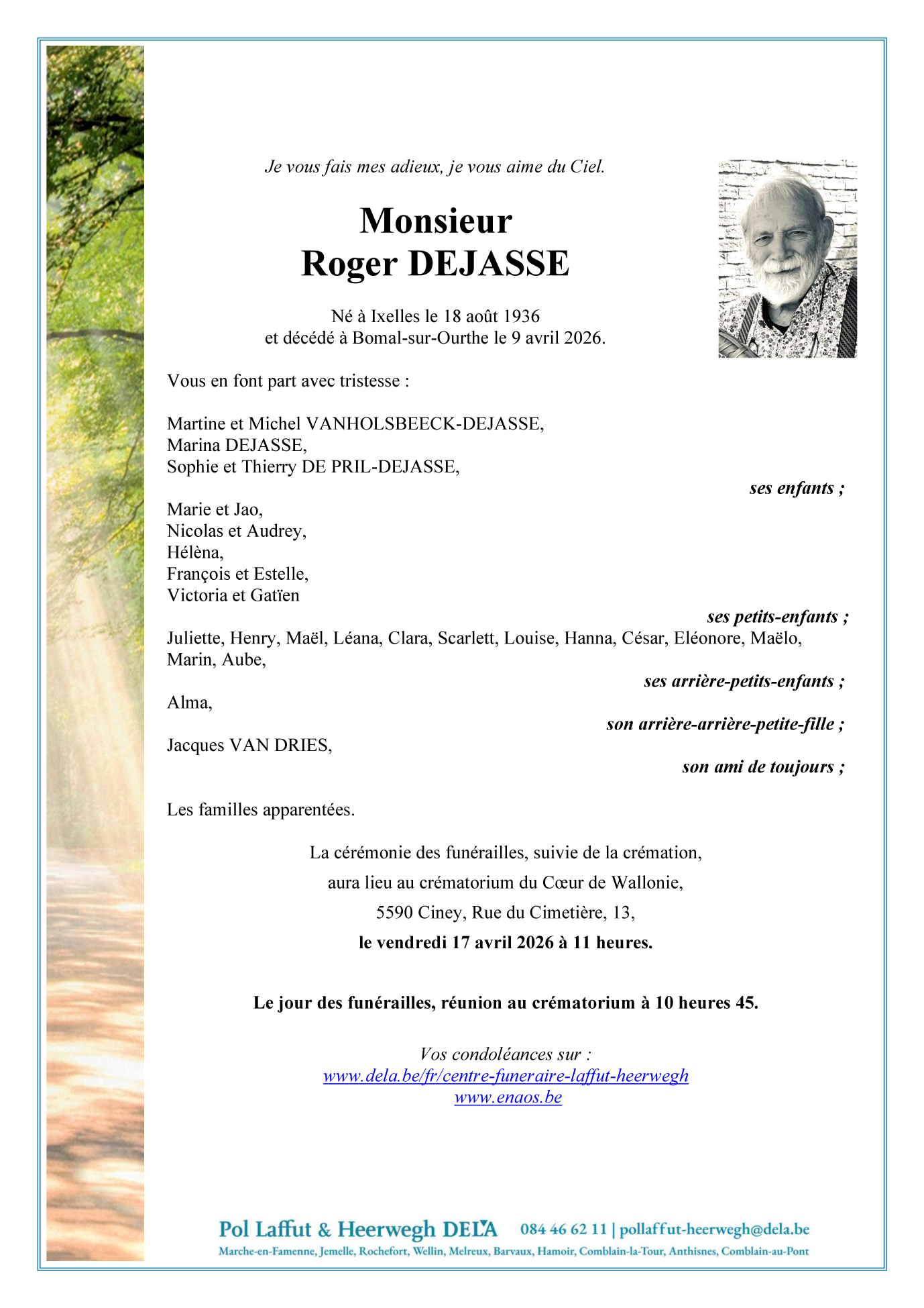 crématorium du Coeur de Wallonie de Ciney el viernes 17 abril a 11horas