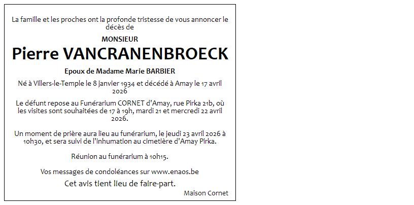Avis de décès de Monsieur Pierre VANCRANENBROECK