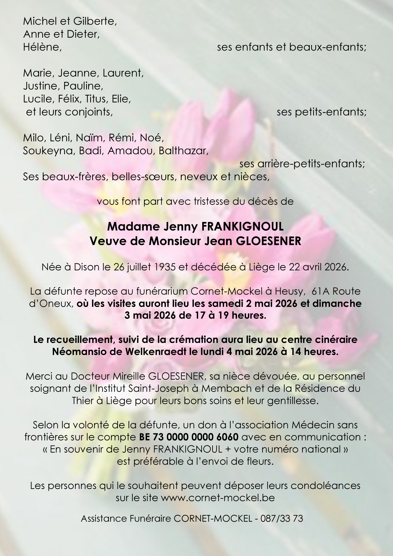 Avis de décès de Madame Jenny FRANKIGNOUL