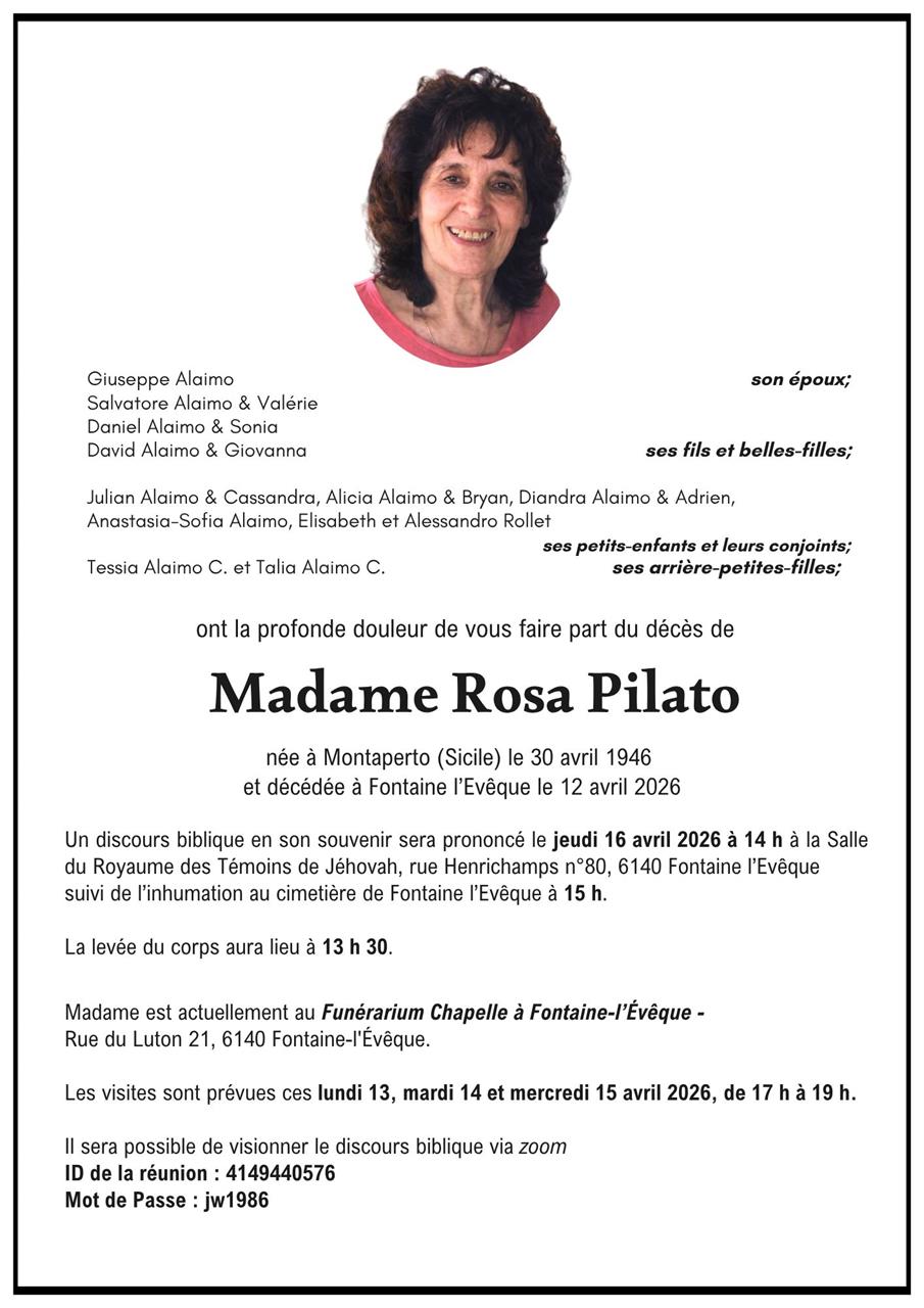 Fallecida en Fontaine-l'Evêque (6140, Bélgica) el domingo, 12 de abril de 2026 a la edad de 79 años