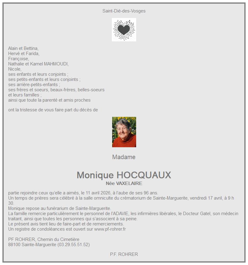 Avis de décès de Titre6[6] Monique HOCQUAUX nacida VAXELAIRE