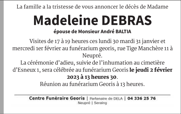 Fallecida en Poulseur (4171, Bélgica) el sábado, 28 de enero de 2023 a la edad de 85 años