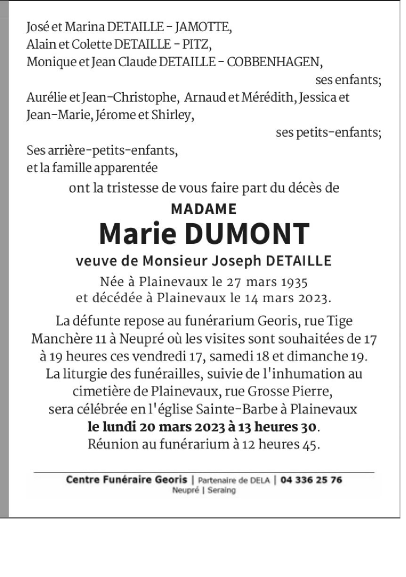 Fallecida en Plainevaux (4122, Bélgica) el martes, 14 de marzo de 2023 a la edad de 87 años