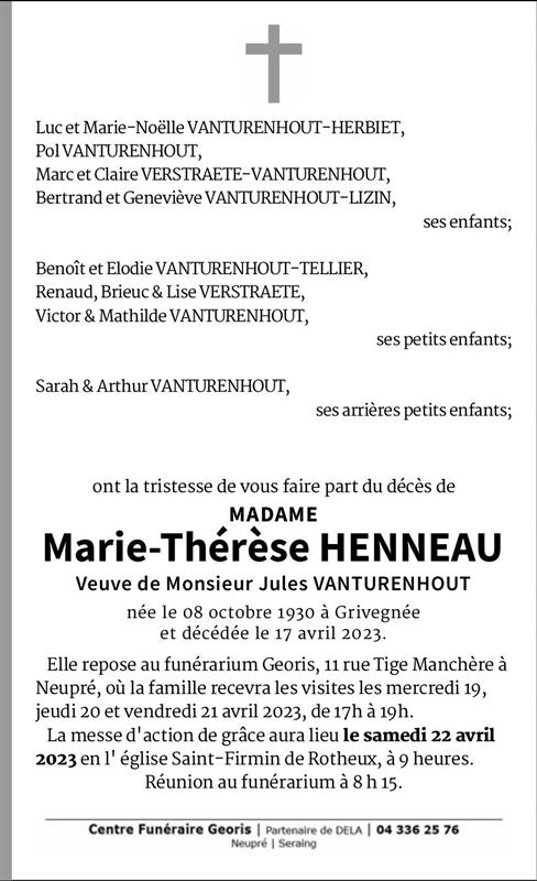 Fallecida en Plainevaux (4122, Bélgica) el lunes, 17 de abril de 2023 a la edad de 92 años
