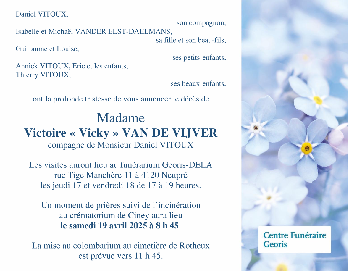 Fallecida en Waremme (4300, Bélgica) el sábado, 12 de abril de 2025 a la edad de 75 años
