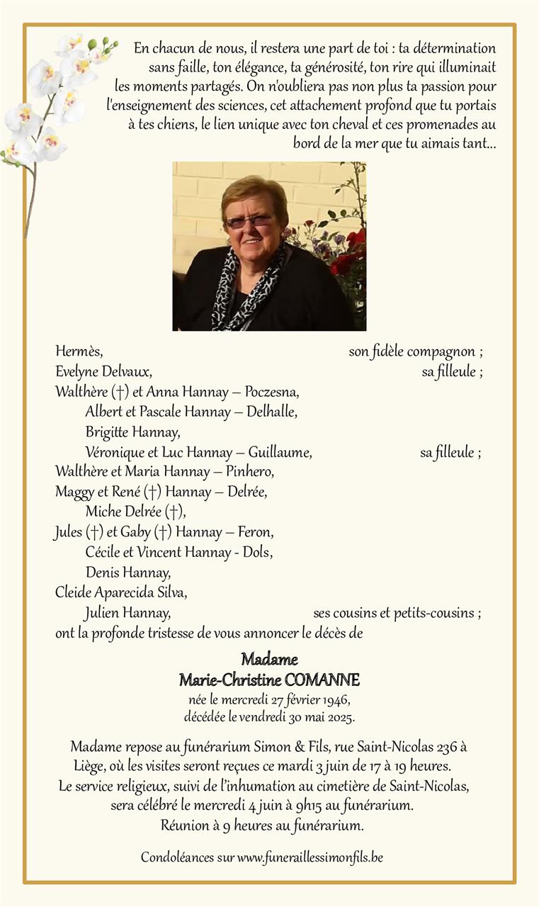 Fallecida en Liège (4000, Bélgica) el viernes, 30 de mayo de 2025 a la edad de 79 años