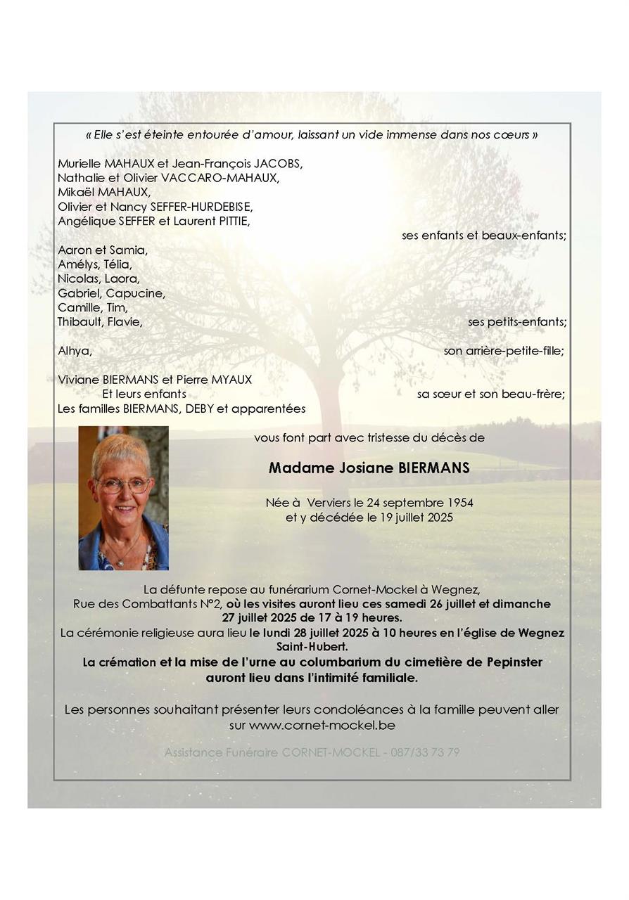 Fallecida en Verviers (4800, Bélgica) el sábado, 19 de julio de 2025 a la edad de 70 años