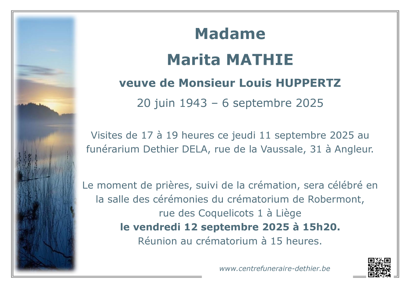 Fallecida en Ougrée (4102, Bélgica) el sábado, 6 de septiembre de 2025 a la edad de 82 años