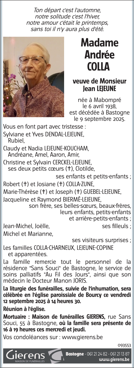 Fallecida en Bastogne (6600, Bélgica) el martes, 9 de septiembre de 2025 a la edad de 87 años