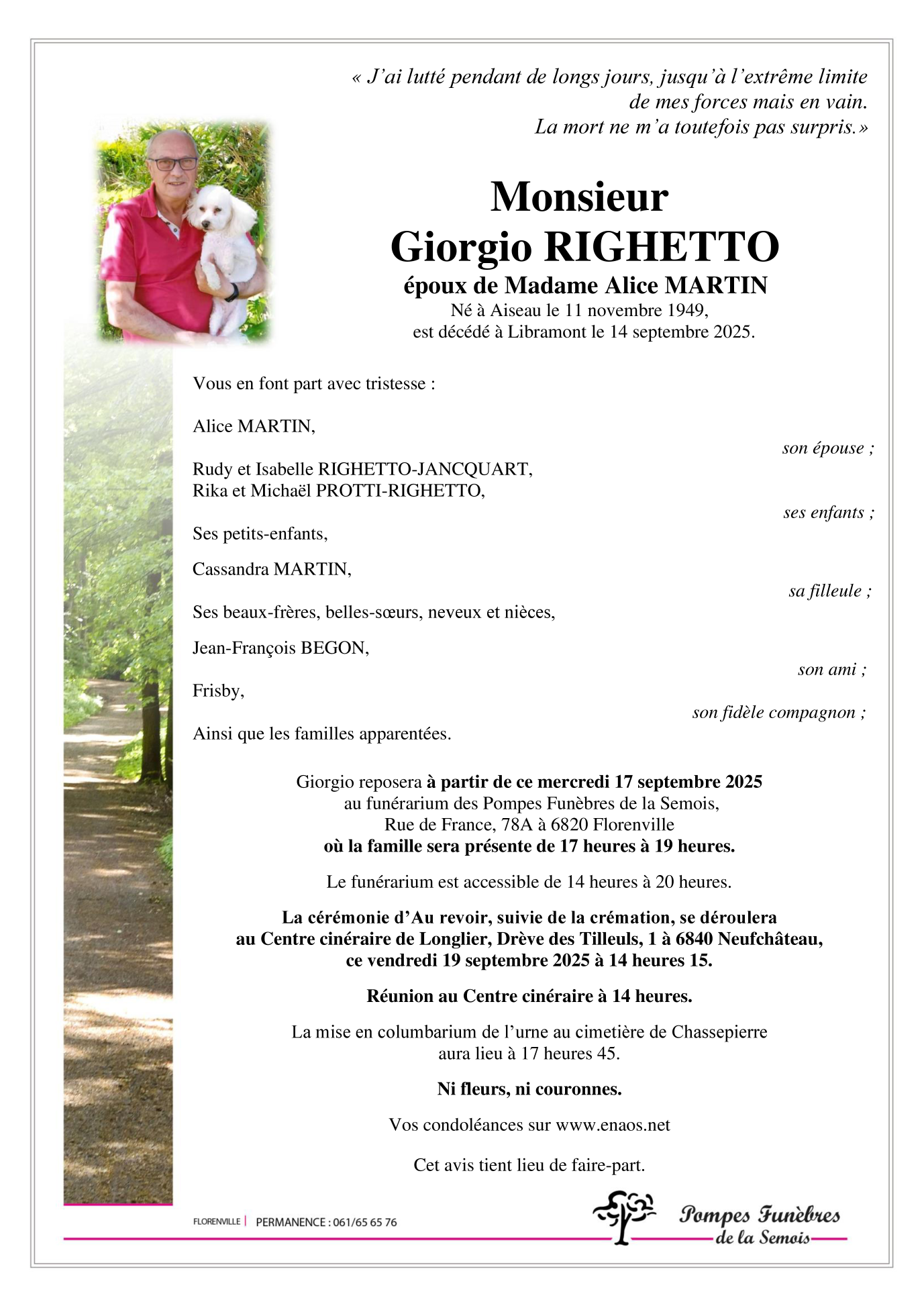 Fallecido en Libramont (6800, Bélgica) el domingo, 14 de septiembre de 2025 a la edad de 75 años