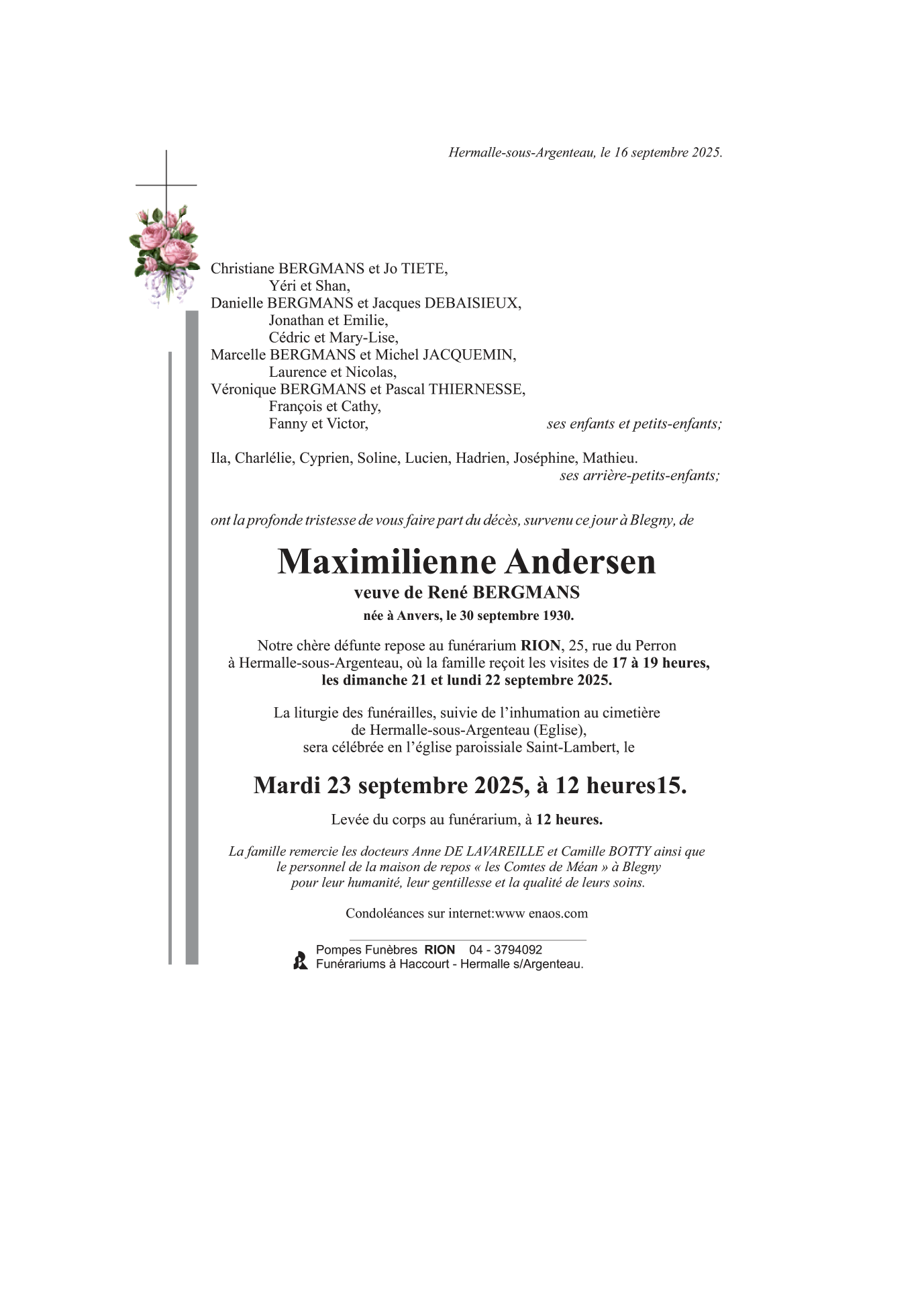 Fallecida en Blegny (4670, Bélgica) el martes, 16 de septiembre de 2025 a la edad de 94 años