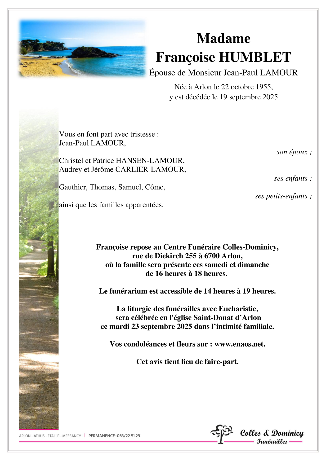 Fallecida en Arlon (6700, Bélgica) el viernes, 19 de septiembre de 2025 a la edad de 69 años