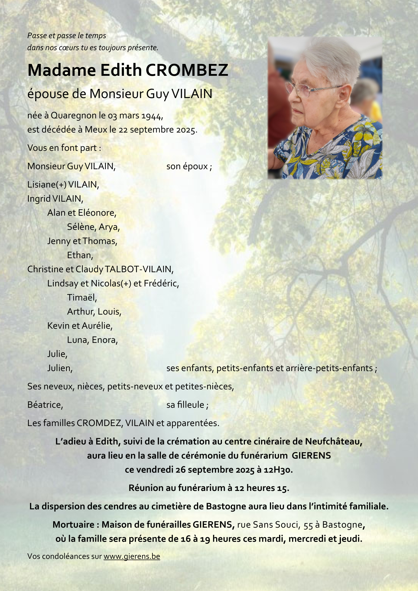 Fallecida en Meux (5081, Bélgica) el lunes, 22 de septiembre de 2025 a la edad de 81 años