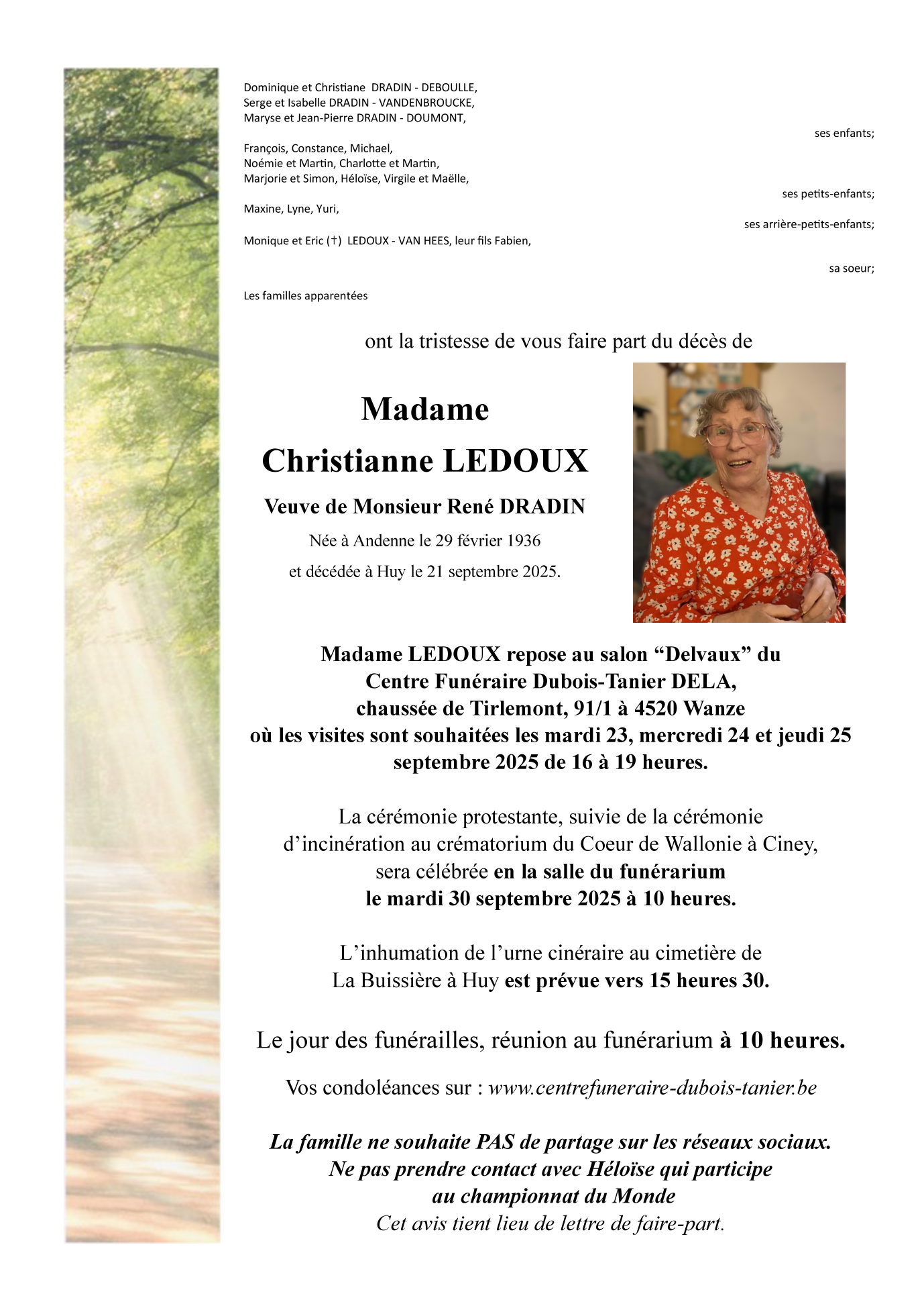 Fallecida en Huy (4500, Bélgica) el domingo, 21 de septiembre de 2025 a la edad de 89 años