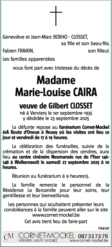 Fallecida en Verviers (4800, Bélgica) el martes, 23 de septiembre de 2025 a la edad de 90 años