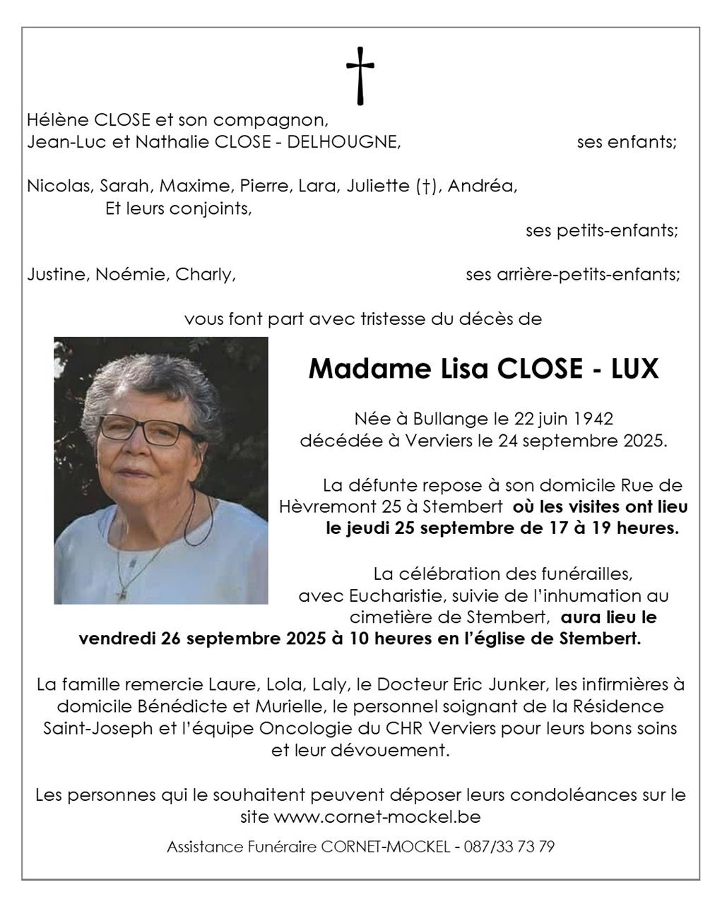 Décédée à Verviers (4800, Belgique) le mercredi 24 septembre 2025 à l'âge de 83 ans
