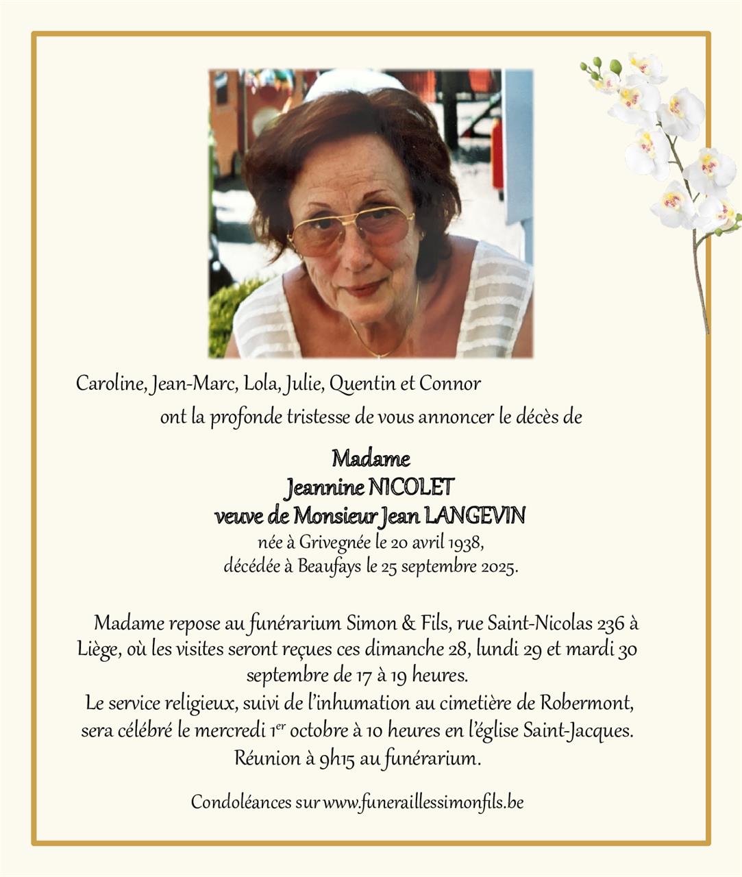 Fallecida en Beaufays (4052, Bélgica) el jueves, 25 de septiembre de 2025 a la edad de 87 años