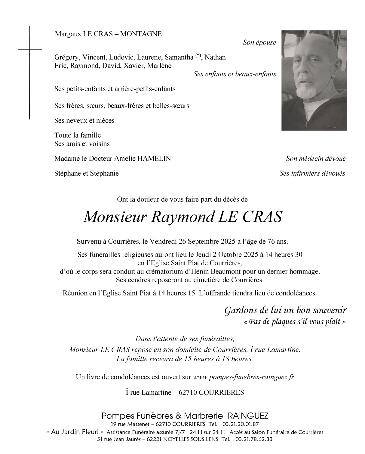 Died in Courrières (62710, France) on 26 September 2025 at the age of 76 years