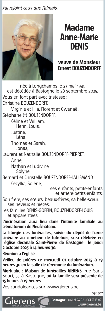 Fallecida en Bastogne (6600, Bélgica) el domingo, 28 de septiembre de 2025 a la edad de 84 años