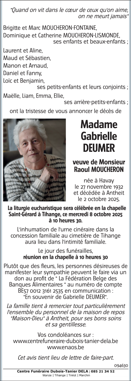 Fallecida en Antheit (4520, Bélgica) el jueves, 2 de octubre de 2025 a la edad de 92 años