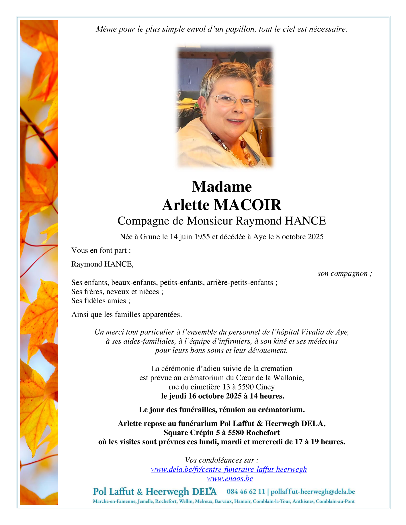 Fallecida en Aye (6900, Bélgica) el miércoles, 8 de octubre de 2025 a la edad de 70 años