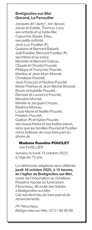 Fallecida en Challans (85300, Francia) el lunes, 13 de octubre de 2025 a la edad de 73 años