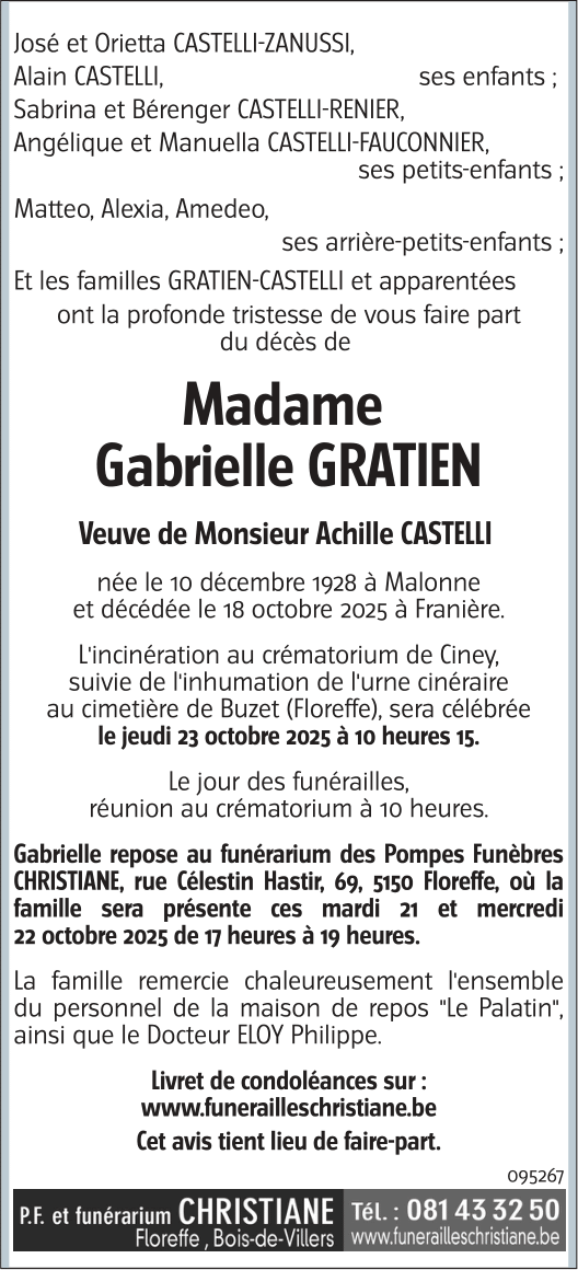 Fallecida en Floreffe (5150, Bélgica) el sábado, 18 de octubre de 2025 a la edad de 96 años