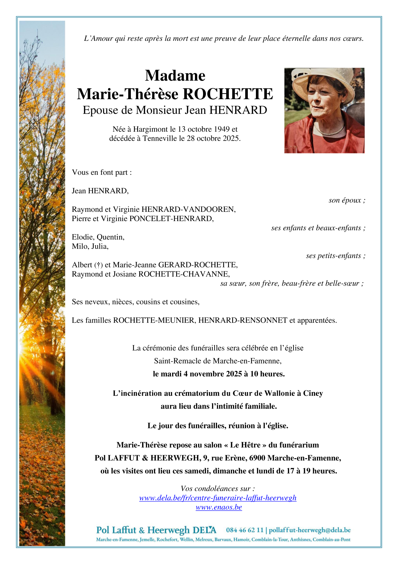 Fallecida en Tenneville (6970, Bélgica) el martes, 28 de octubre de 2025 a la edad de 76 años
