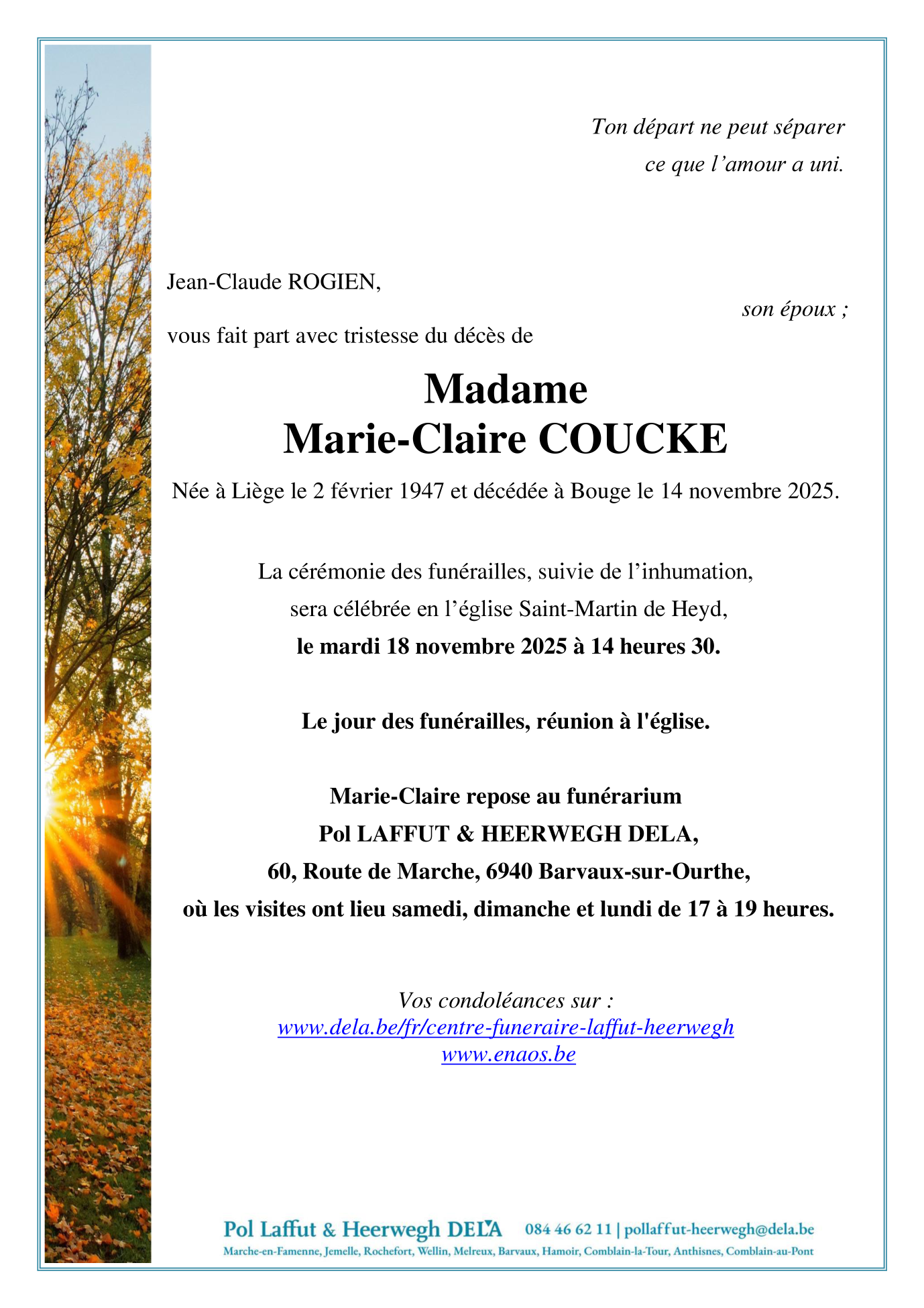 Fallecida en Bouge (5004, Bélgica) el viernes, 14 de noviembre de 2025 a la edad de 78 años