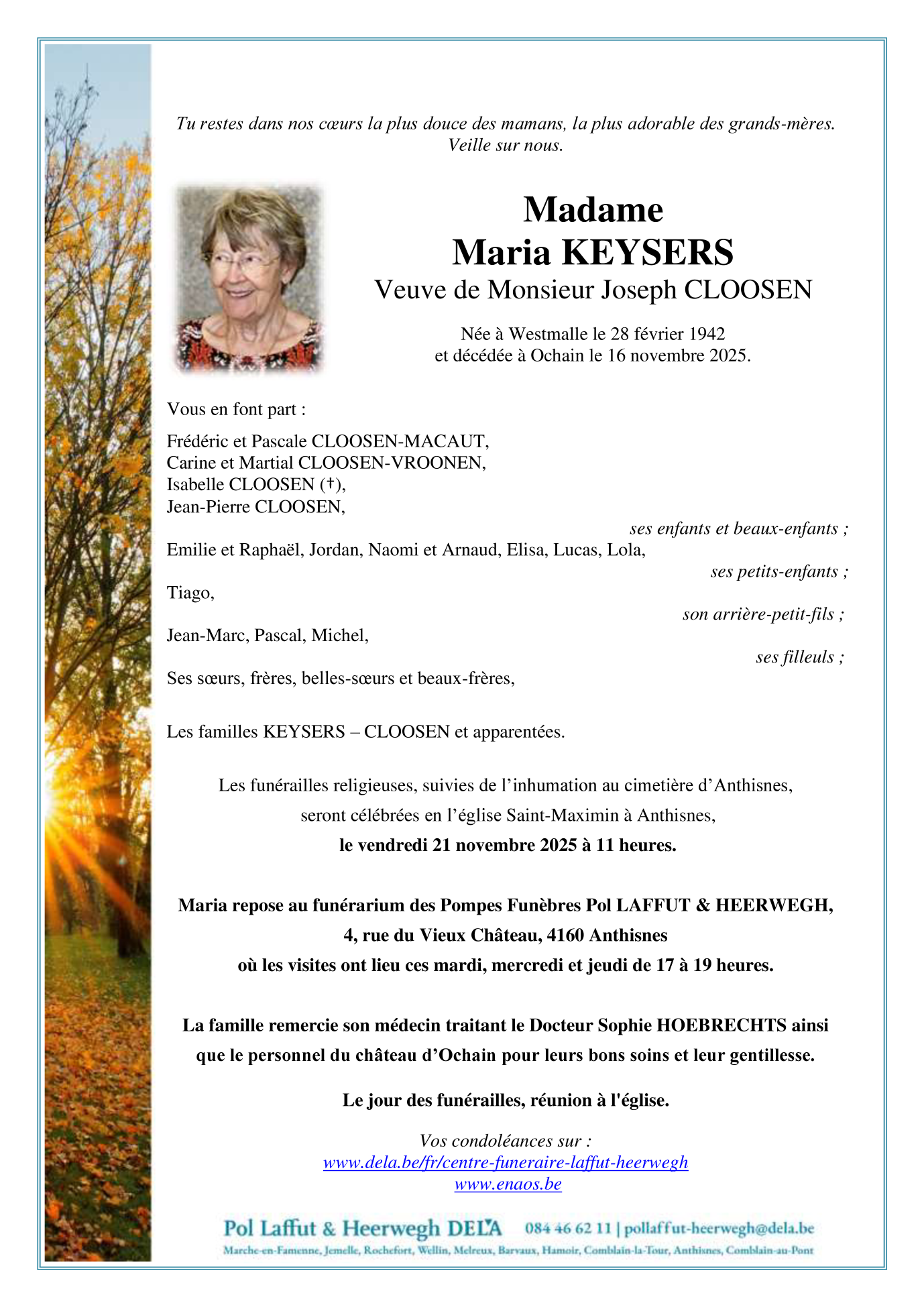 Fallecida en Ochain (4560, Bélgica) el domingo, 16 de noviembre de 2025 a la edad de 83 años