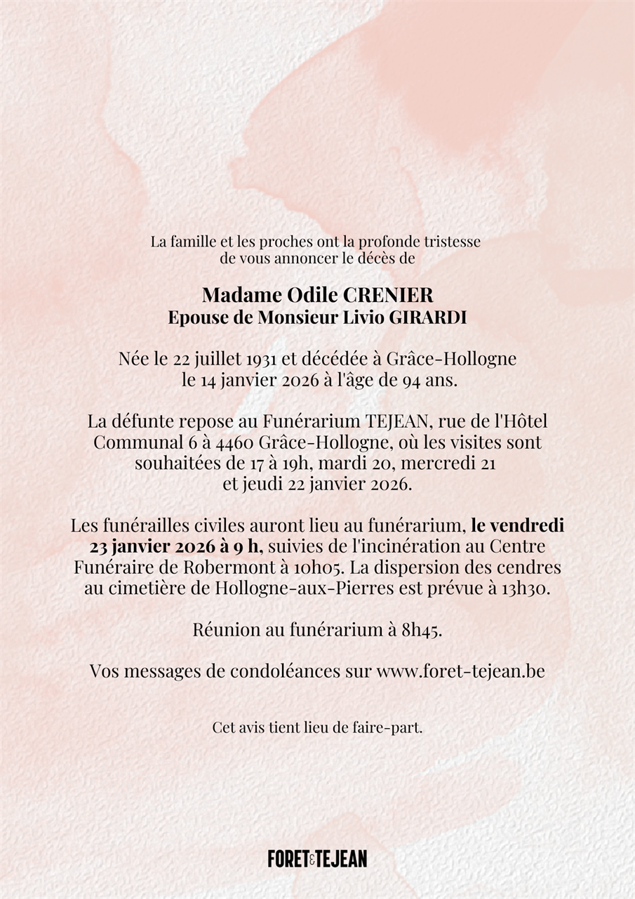 Died in Grâce-Hollogne (4460, Belgium) on 14 January 2026 at the age of 94 years