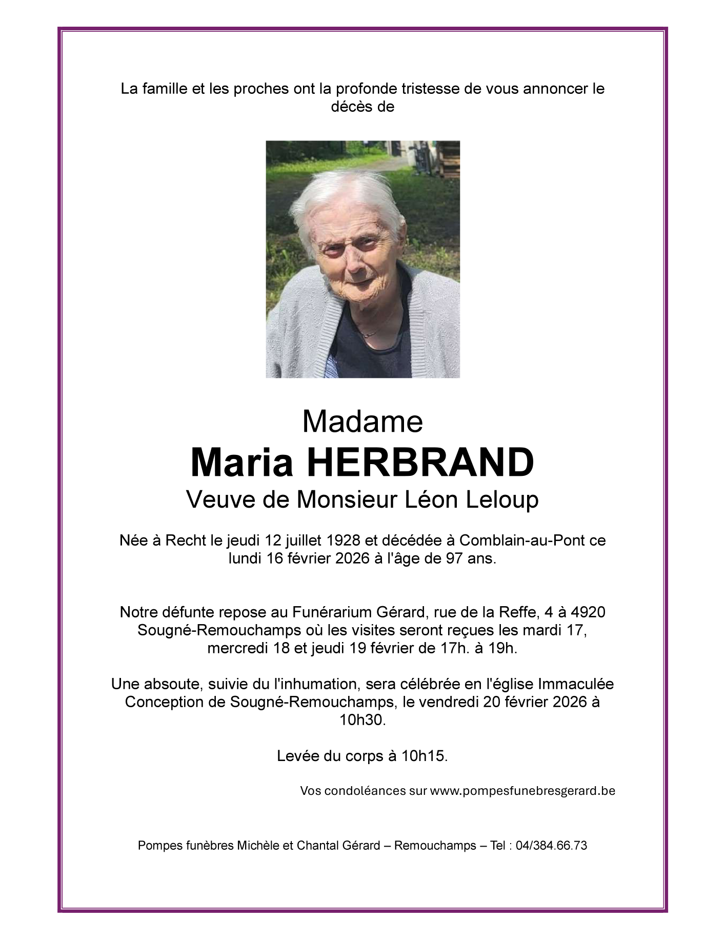 Overleden te Comblain-au-Pont (4170, België) op maandag 16 februari 2026 op 97-jarige leeftijd