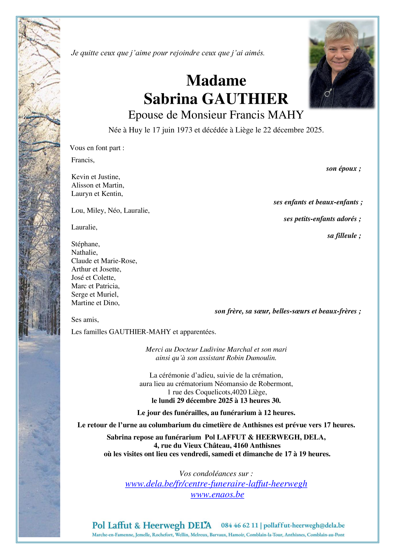 Fallecida en Liège (4000, Bélgica) el lunes, 22 de diciembre de 2025 a la edad de 52 años