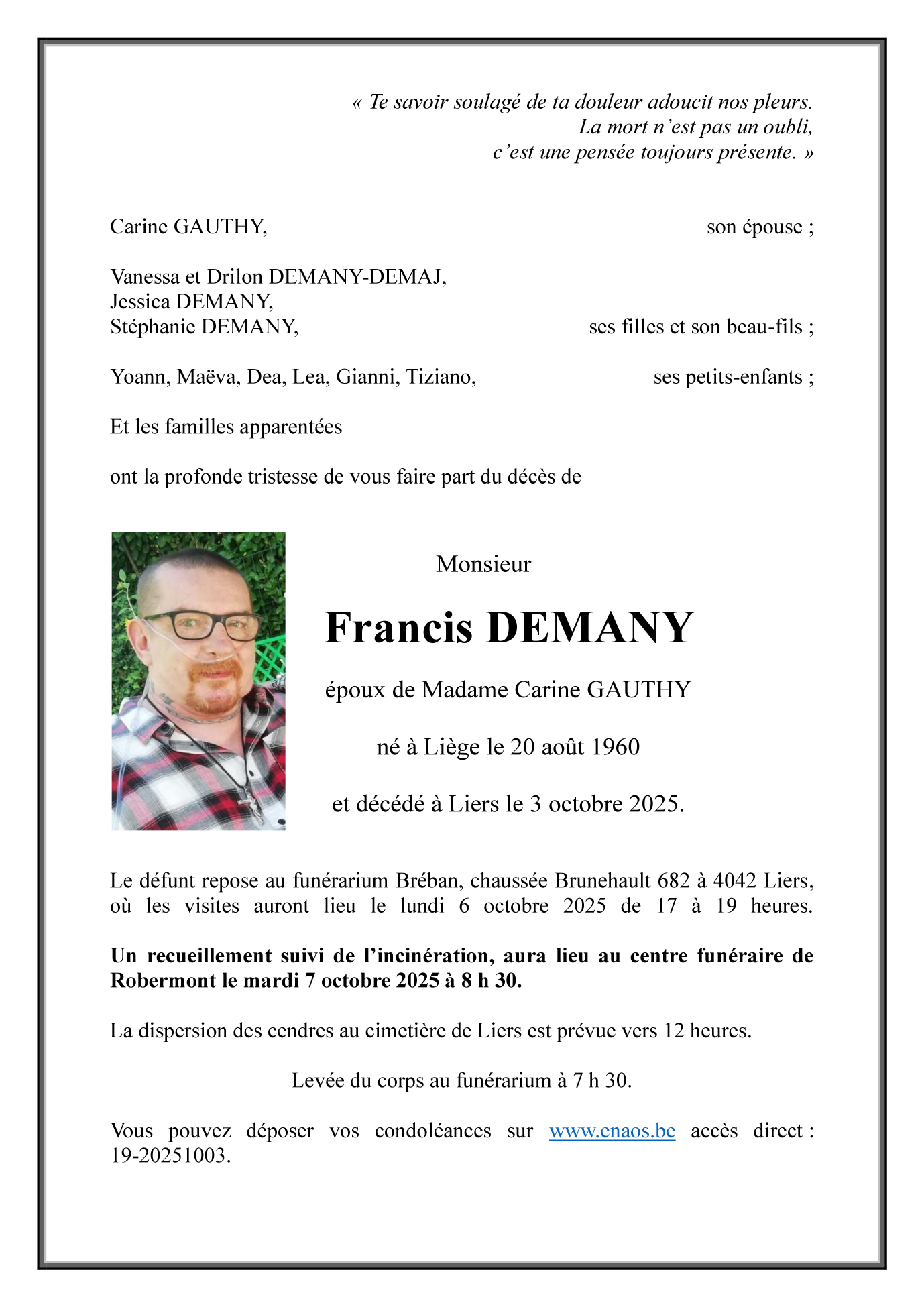 Overleden te Liers (4042, België) op vrijdag 3 oktober 2025 op 65-jarige leeftijd