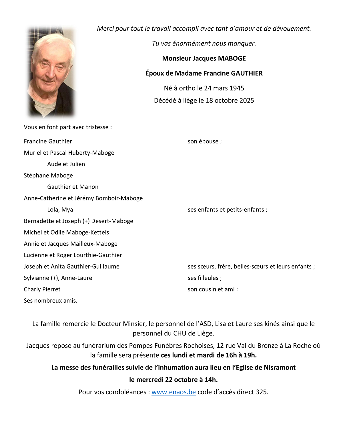 Died in Liège (4000, Belgium) on 18 October 2025 at the age of 80 years