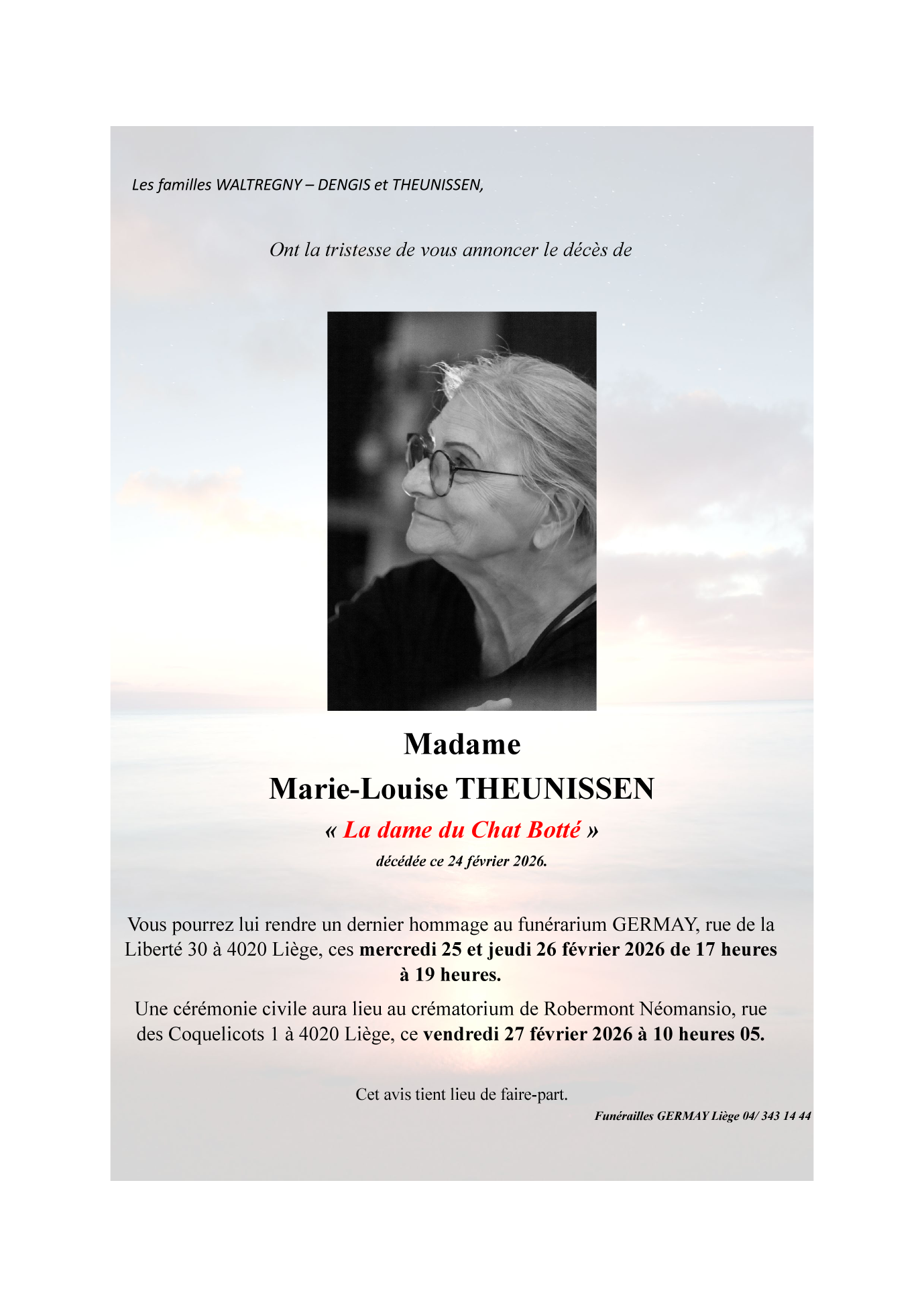 Décédée à Liège (4020, Belgique) le mardi 24 février 2026 à l'âge de 83 ans