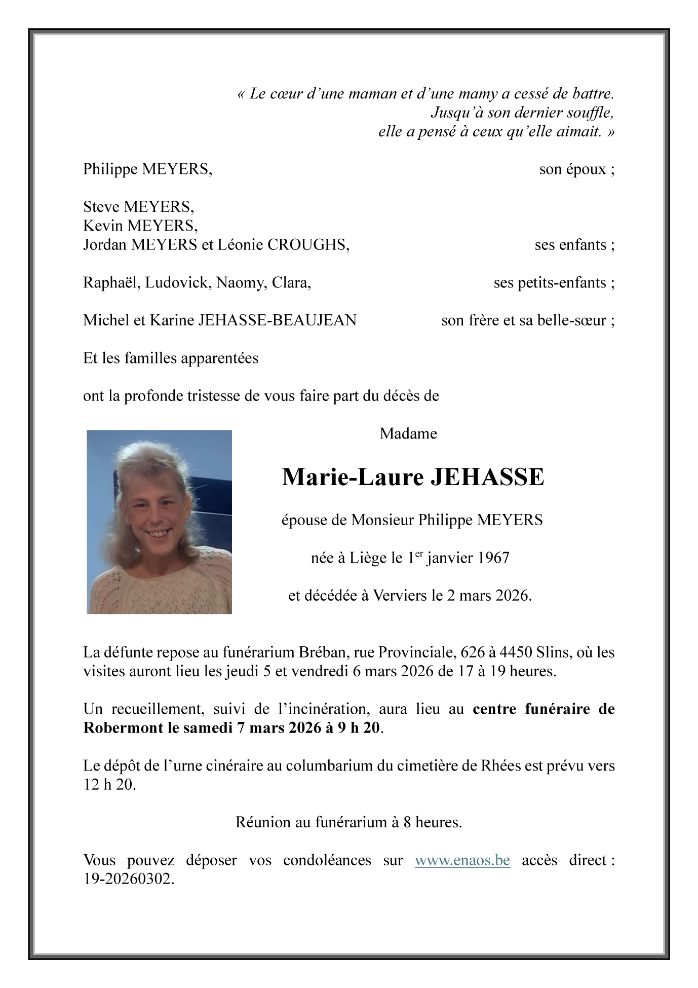 Décédée à Heusy (4802, Belgique) le lundi 2 mars 2026 à l'âge de 59 ans