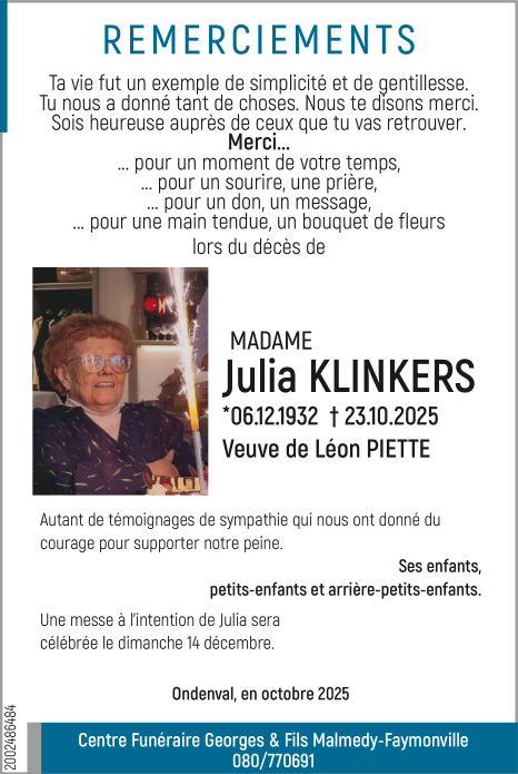 Madame Julia KLINKERS veuve de Léon PIETTE