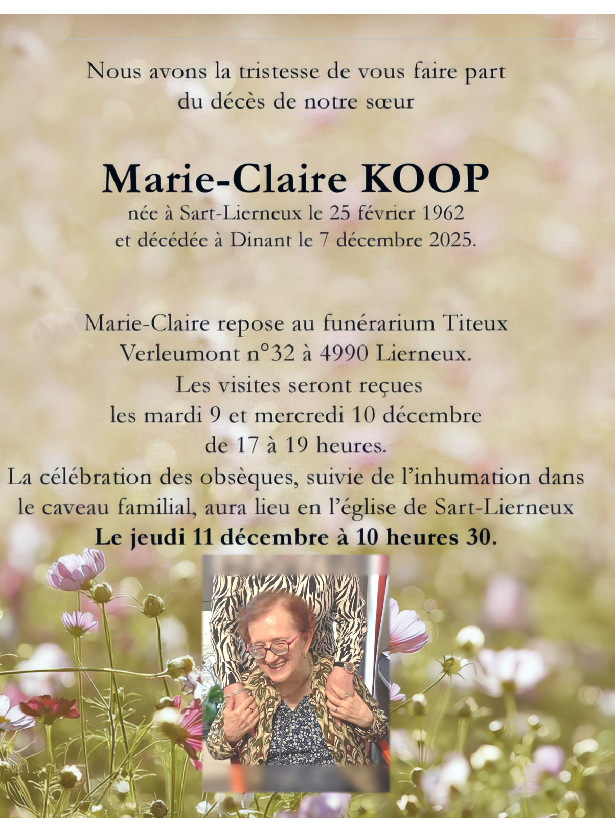 Fallecida en Dinant (5500, Bélgica) el domingo, 7 de diciembre de 2025 a la edad de 63 años