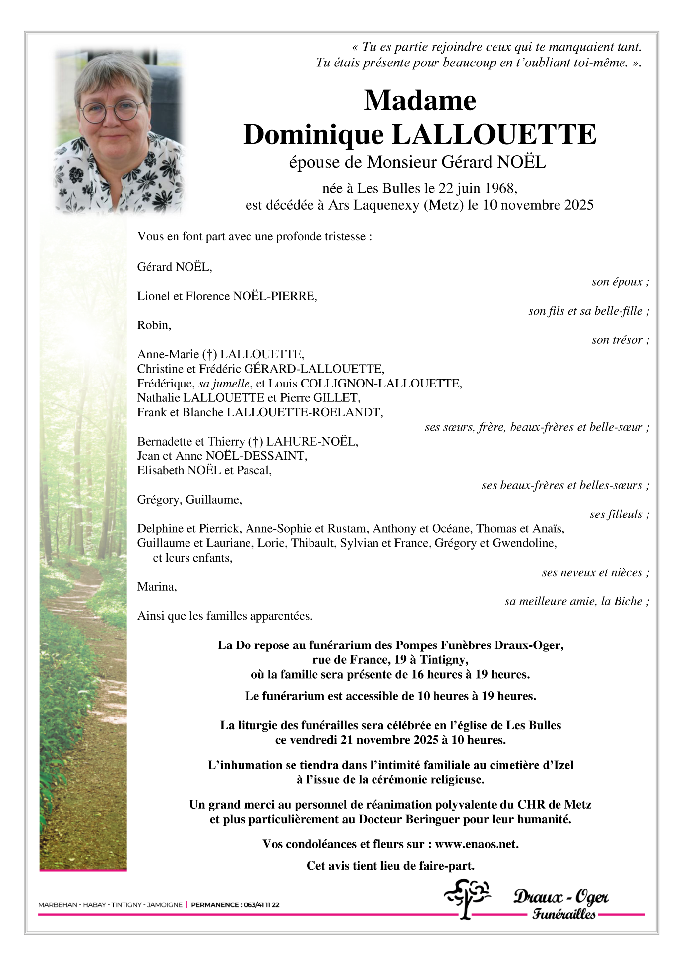 Fallecida en Ars-Laquenexy (57530, Francia) el lunes, 10 de noviembre de 2025 a la edad de 57 años