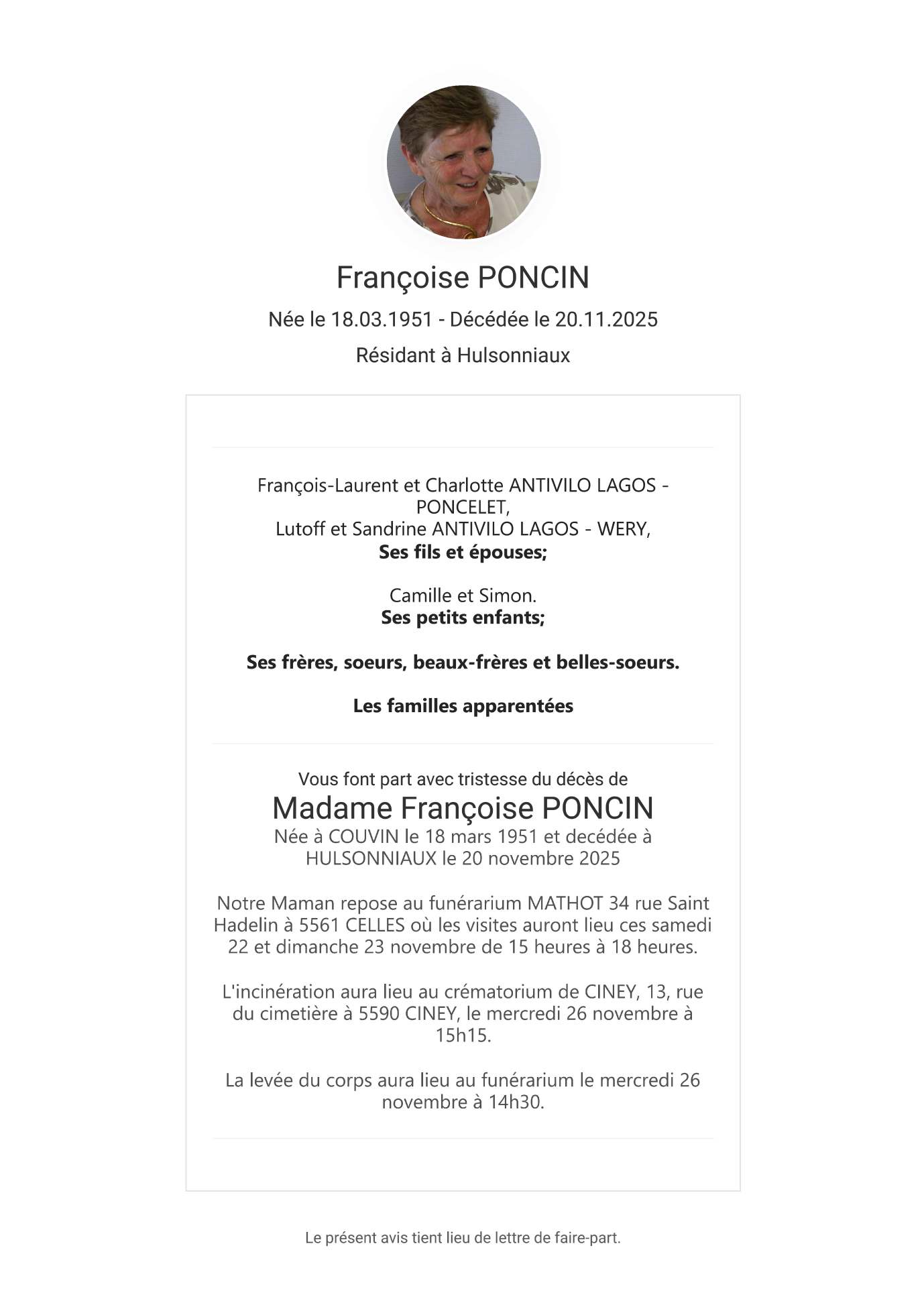 Fallecida en Hulsonniaux (5560, Bélgica) el jueves, 20 de noviembre de 2025 a la edad de 74 años
