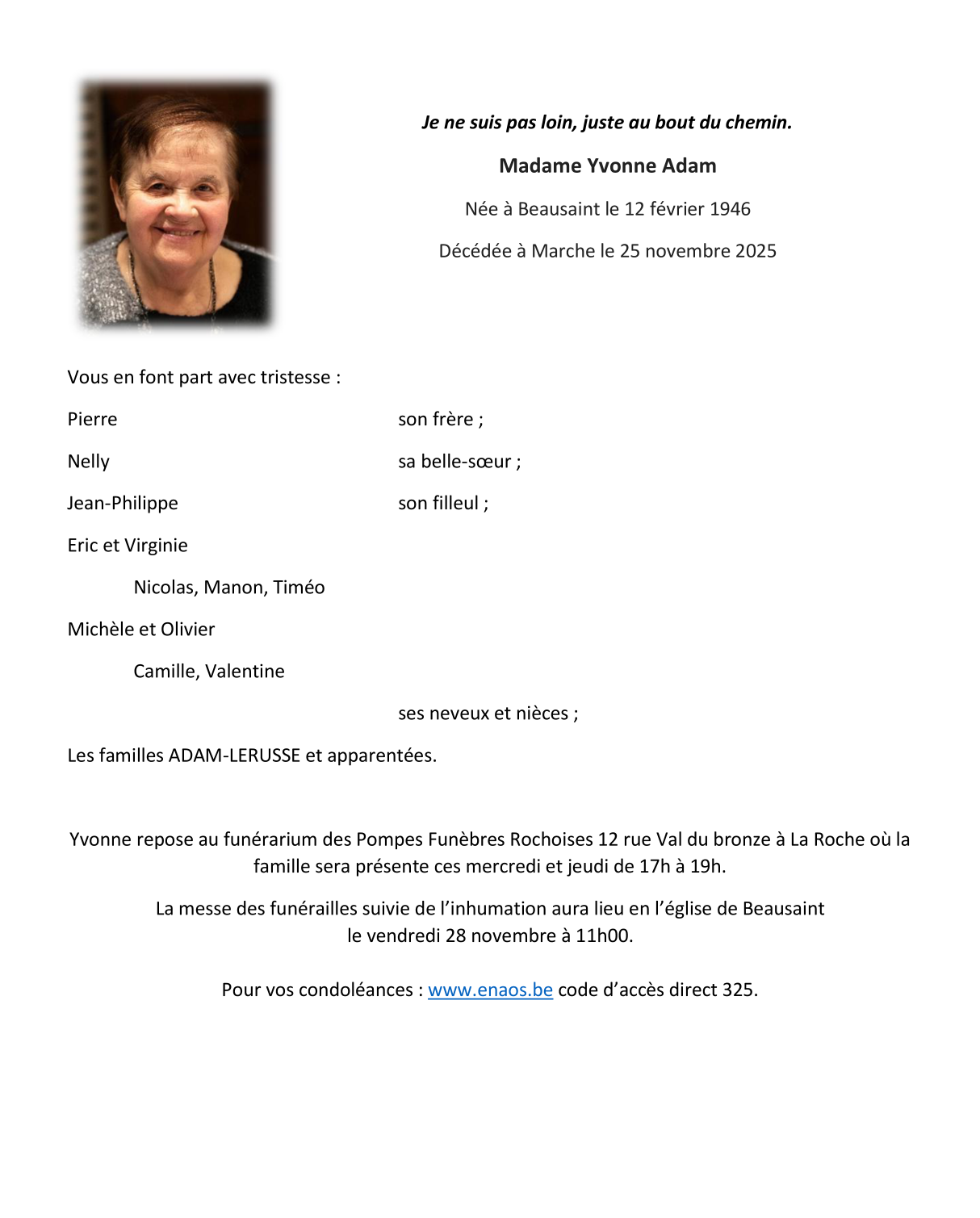 Fallecida en Marche-en-Famenne (6900, Bélgica) el martes, 25 de noviembre de 2025 a la edad de 79 años