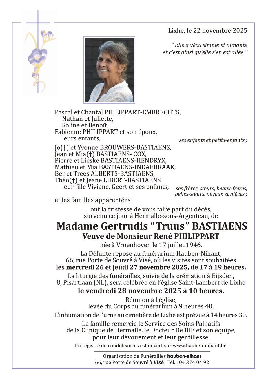 Fallecida en Hermalle-sous-Argenteau (4681, Bélgica) el sábado, 22 de noviembre de 2025 a la edad de 79 años
