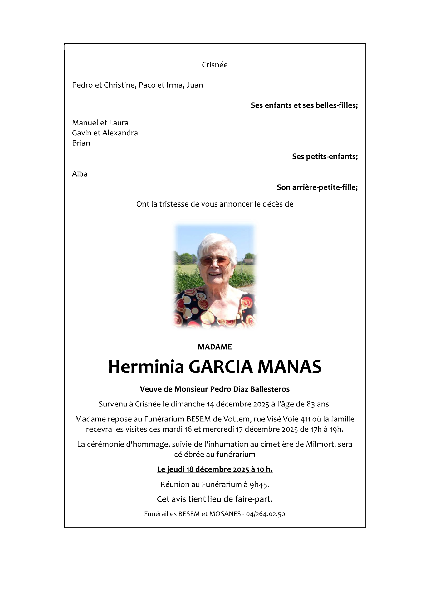 Fallecida en Crisnée (4367, Bélgica) el domingo, 14 de diciembre de 2025 a la edad de 83 años