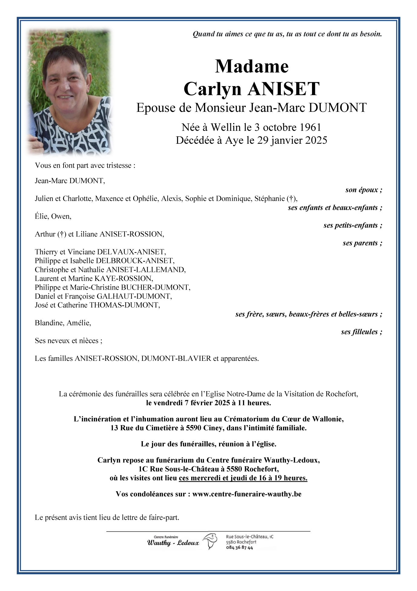 Décédée à Rochefort (5580, Belgique) le mercredi 29 janvier 2025 à l'âge de 63 ans