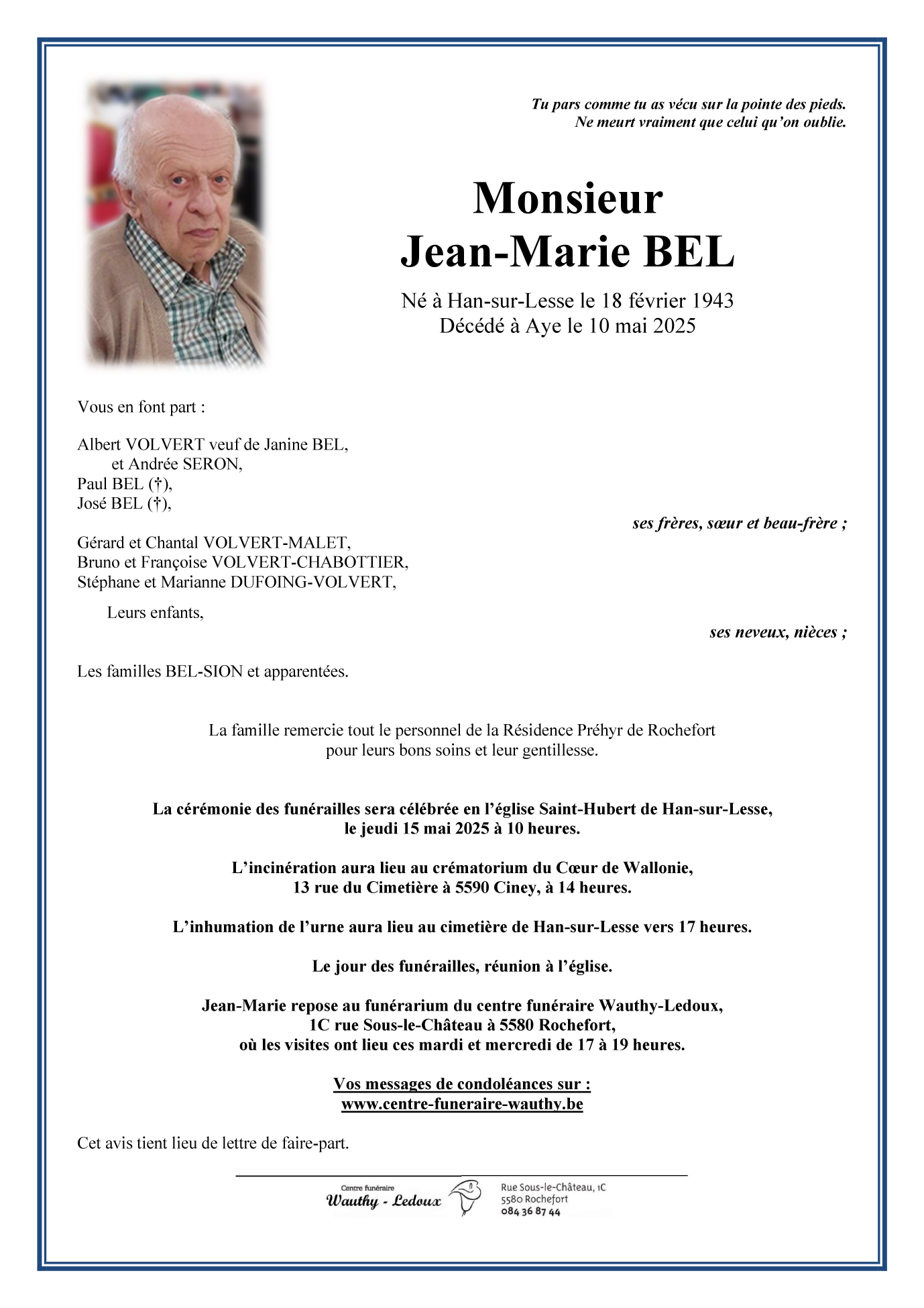 Overleden te Aye (6900, België) op zaterdag 10 mei 2025 op 82-jarige leeftijd