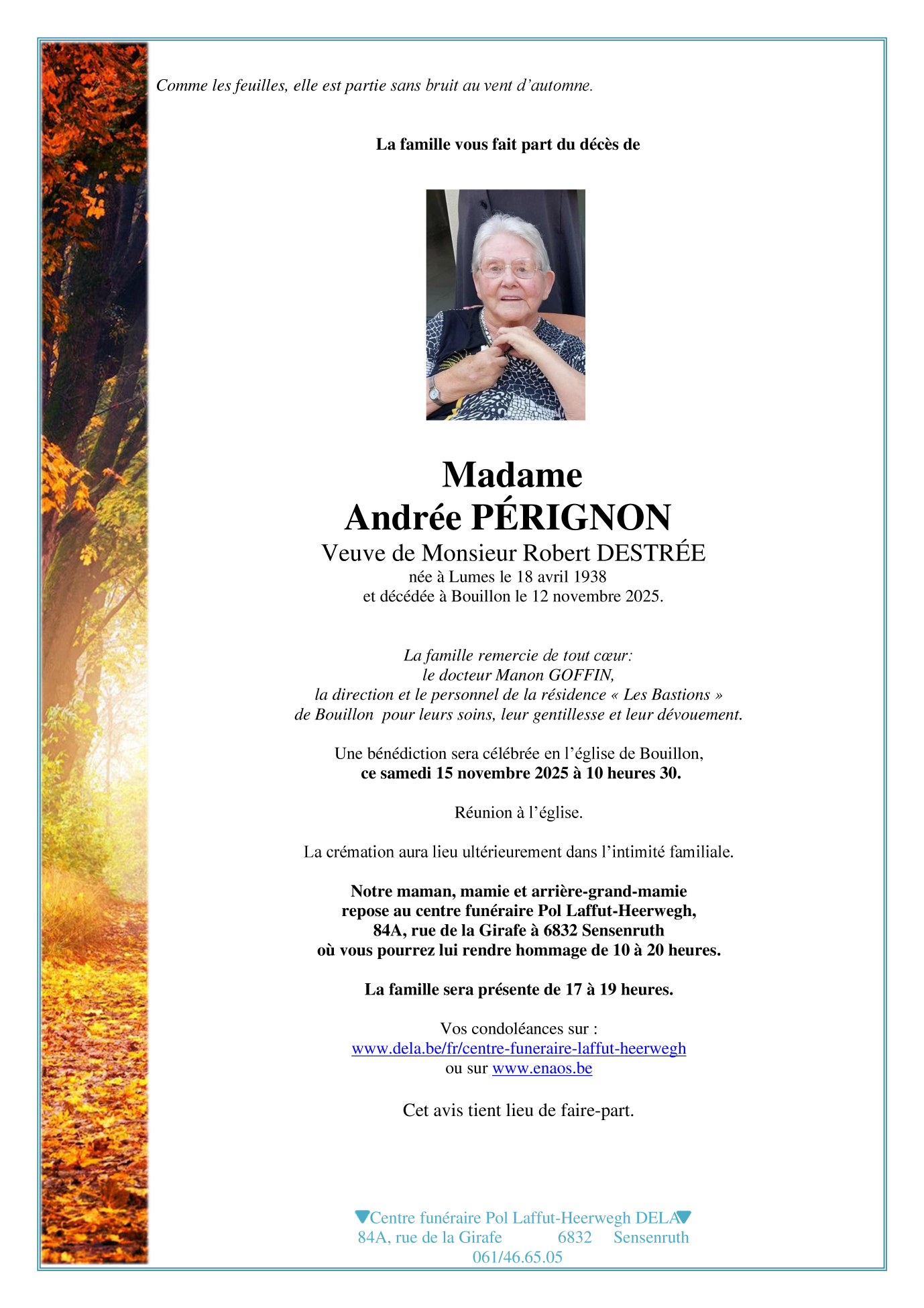 Fallecida en Bouillon (6830, Bélgica) el jueves, 13 de noviembre de 2025 a la edad de 87 años