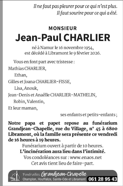 Overleden te Libramont (6800, België) op maandag 9 februari 2026 op 71-jarige leeftijd
